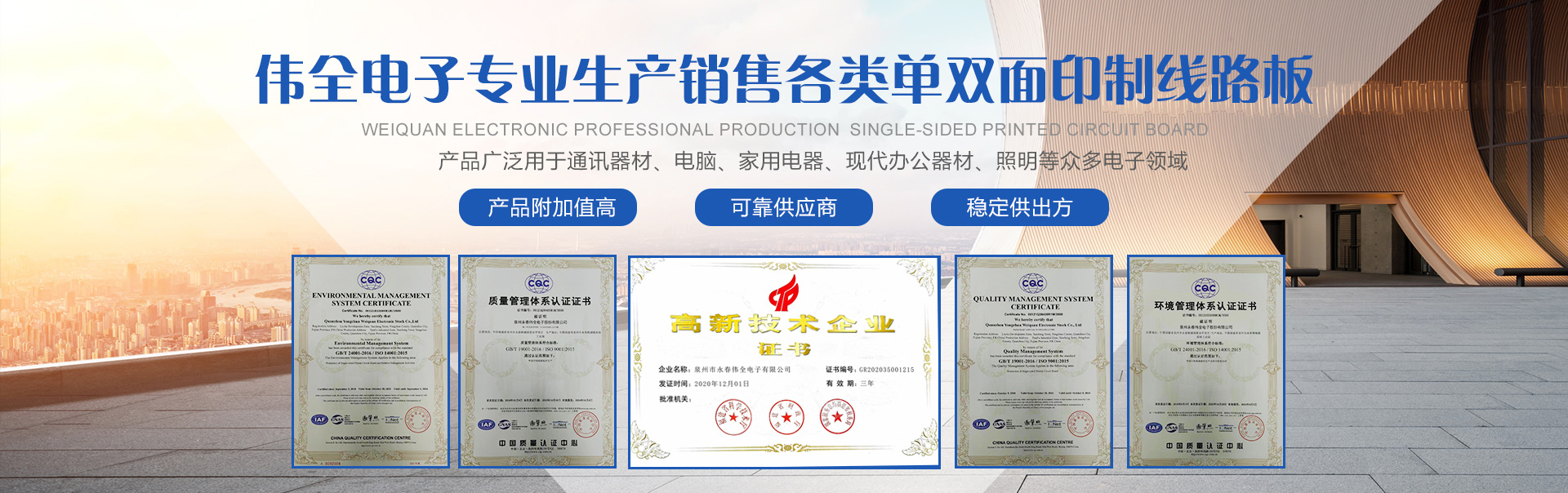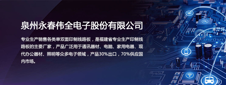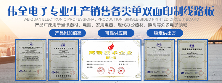 泉州永春偉全電子股份有限公司是一家合資企業(yè)。創(chuàng)辦于2011年,專業(yè)生產各類單面印制線路板,是福建省專業(yè)生產印制線路板的主要廠家,公司坐落在泉州市永春縣桃城鎮留安開發(fā)區添福工業(yè)園,占地面積達10多畝,交通方便。公司現有員工80多人,總投資3000多萬元人民幣,年生產能力逾20萬平方米。